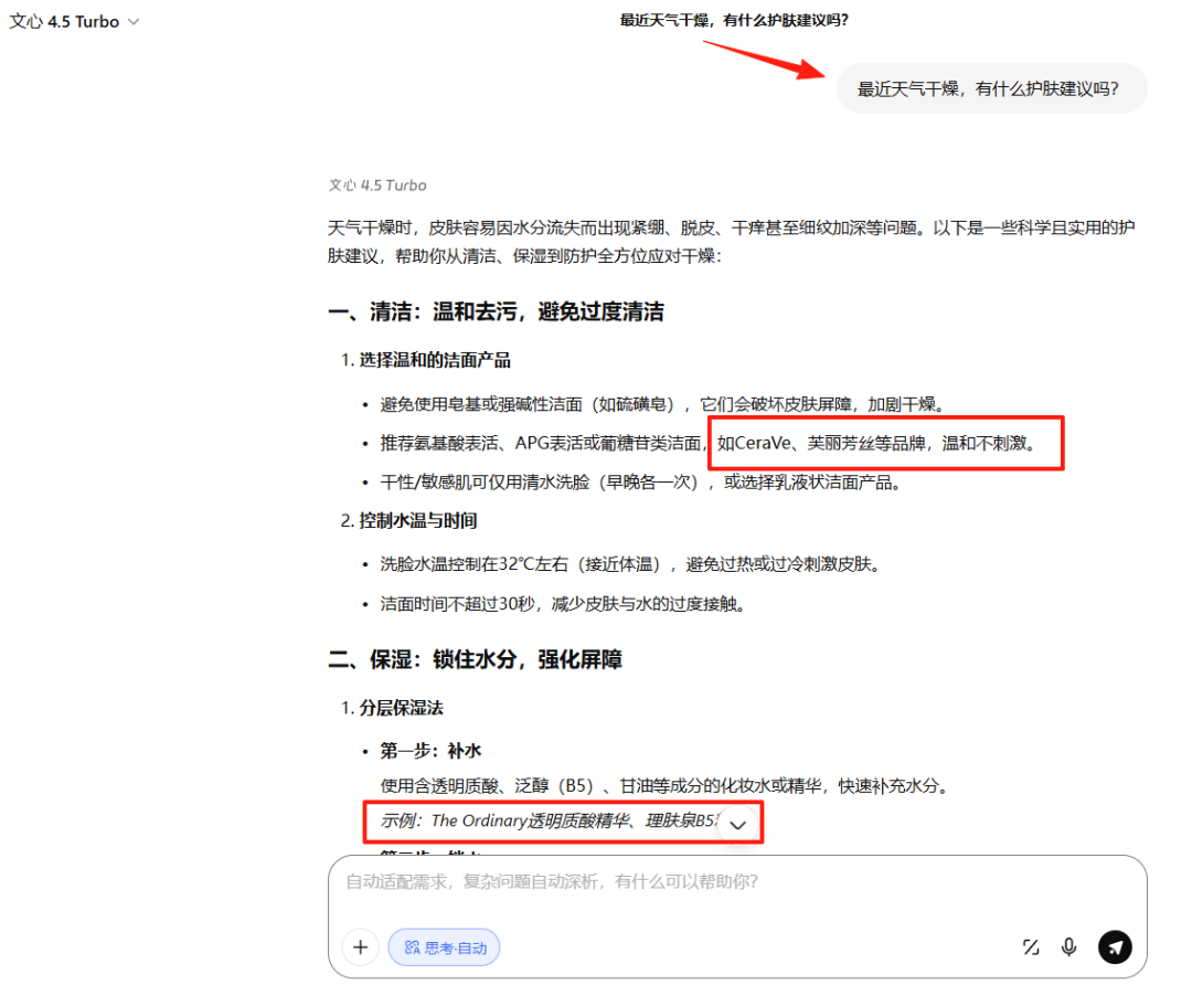 有一家主营护肤品的商家,过去在短视频平台烧钱投放,每个月花几十万广告费,虽然曝光量大,但转化率不到2%。后来,他们尝试在AI对话场景里植入广告,当用户咨询“秋冬护肤该怎么选”时,AI会给出护理建议,并自然推荐他们的保湿系列产品。